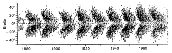 Gesetzmäßigkeit: Im Verlaufe eines Zyklus treten die Flecken in